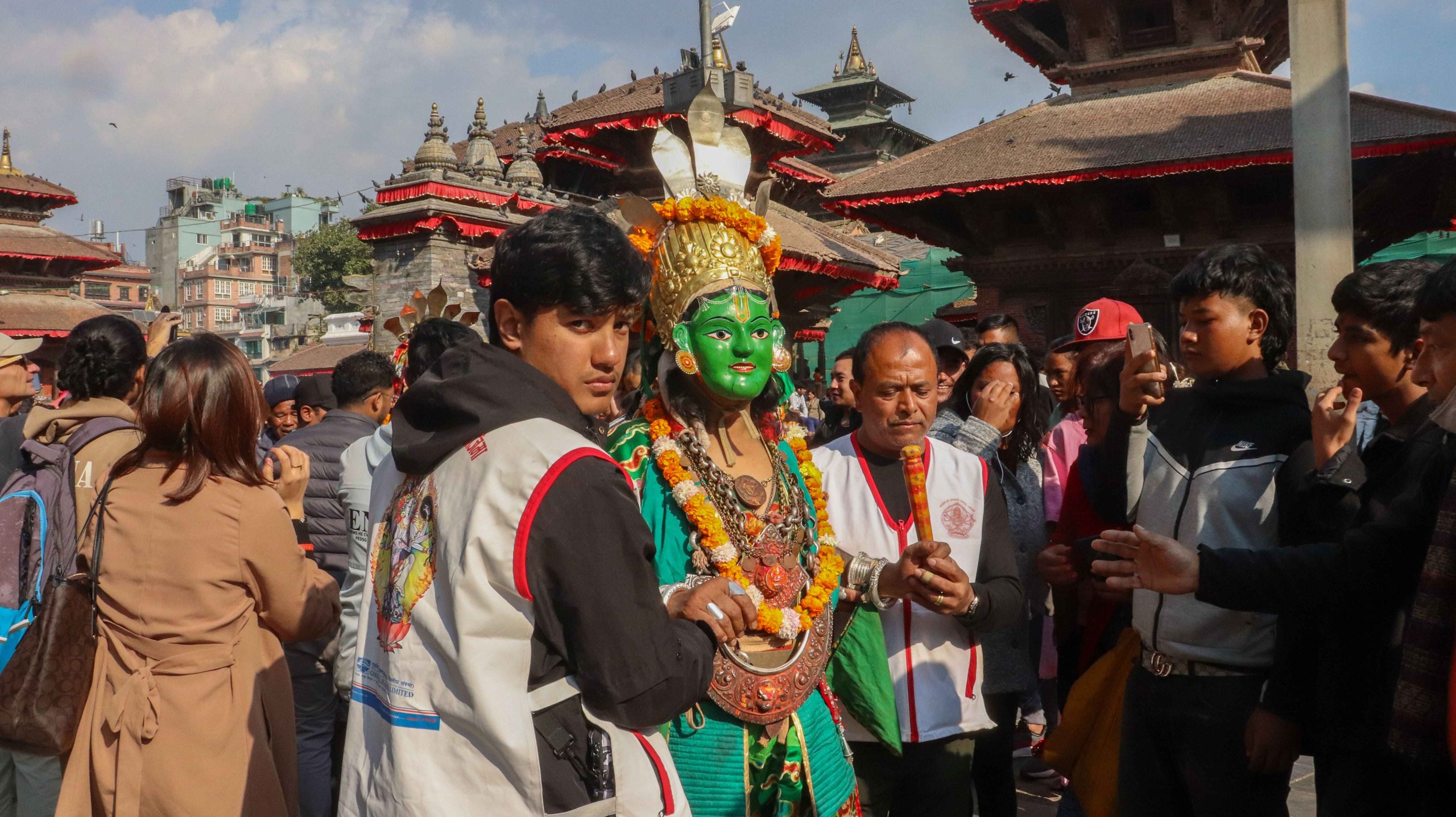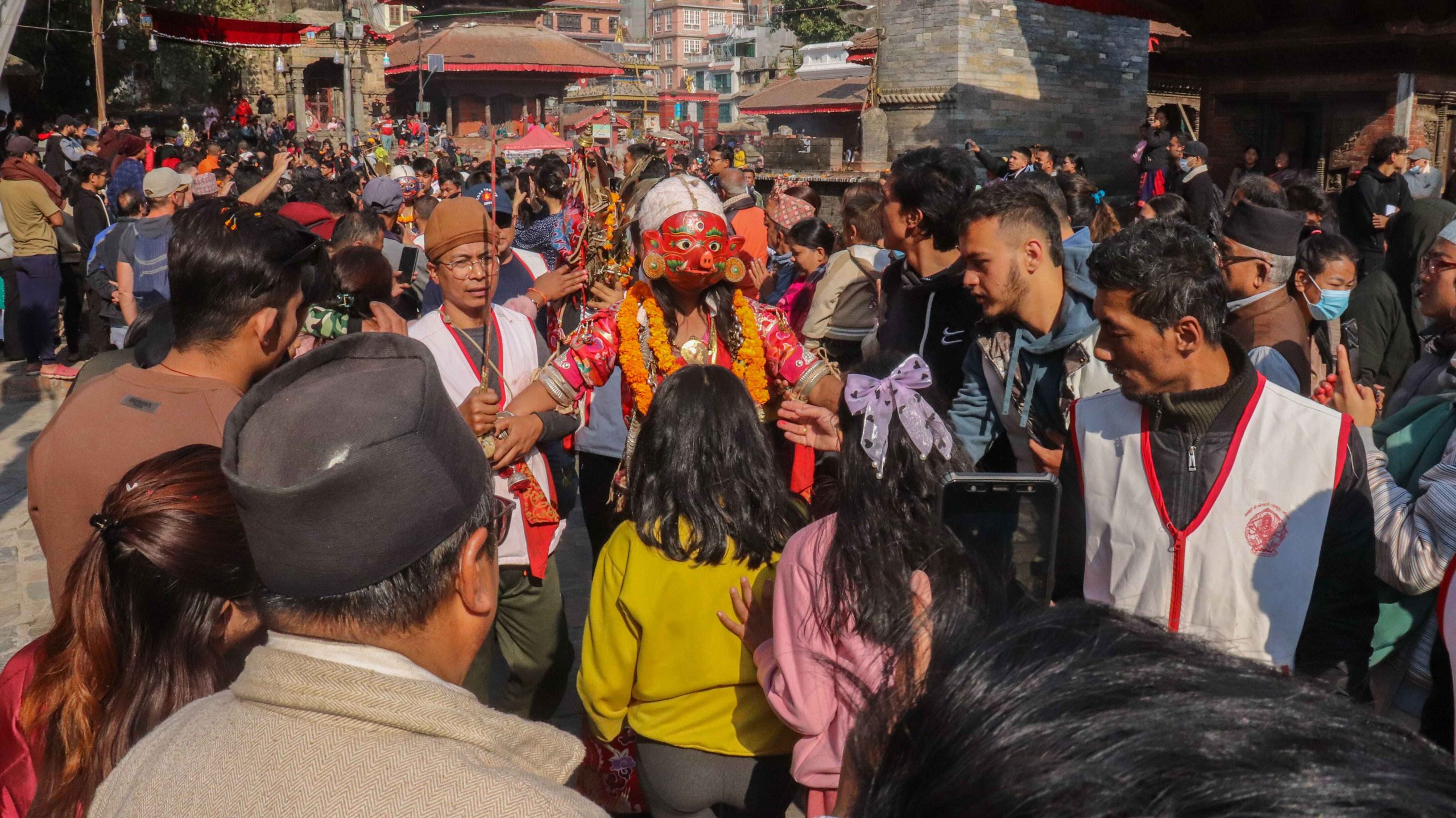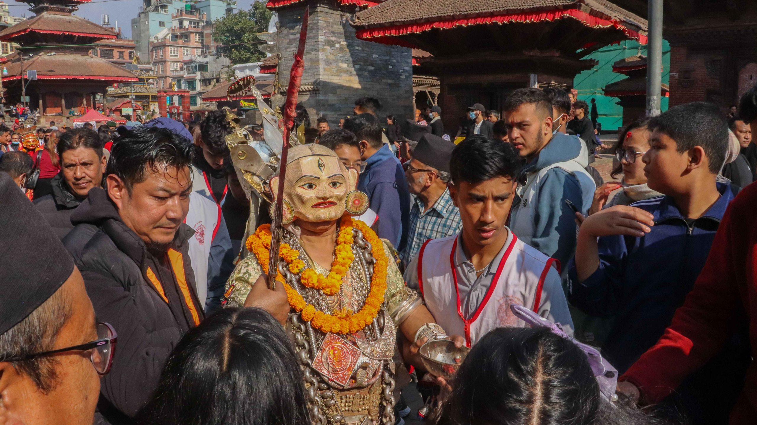 काठमाडौँ नरदेवीस्थित ङत भुलु’ अर्थात् श्वेतकाली अजिमा बाह्रवर्षे जात्राको क्रममा शनिबार हुनुमानढोको कालभैरवअगाडि डबलीमा नाचको क्रममा श्रीगणेश ।
