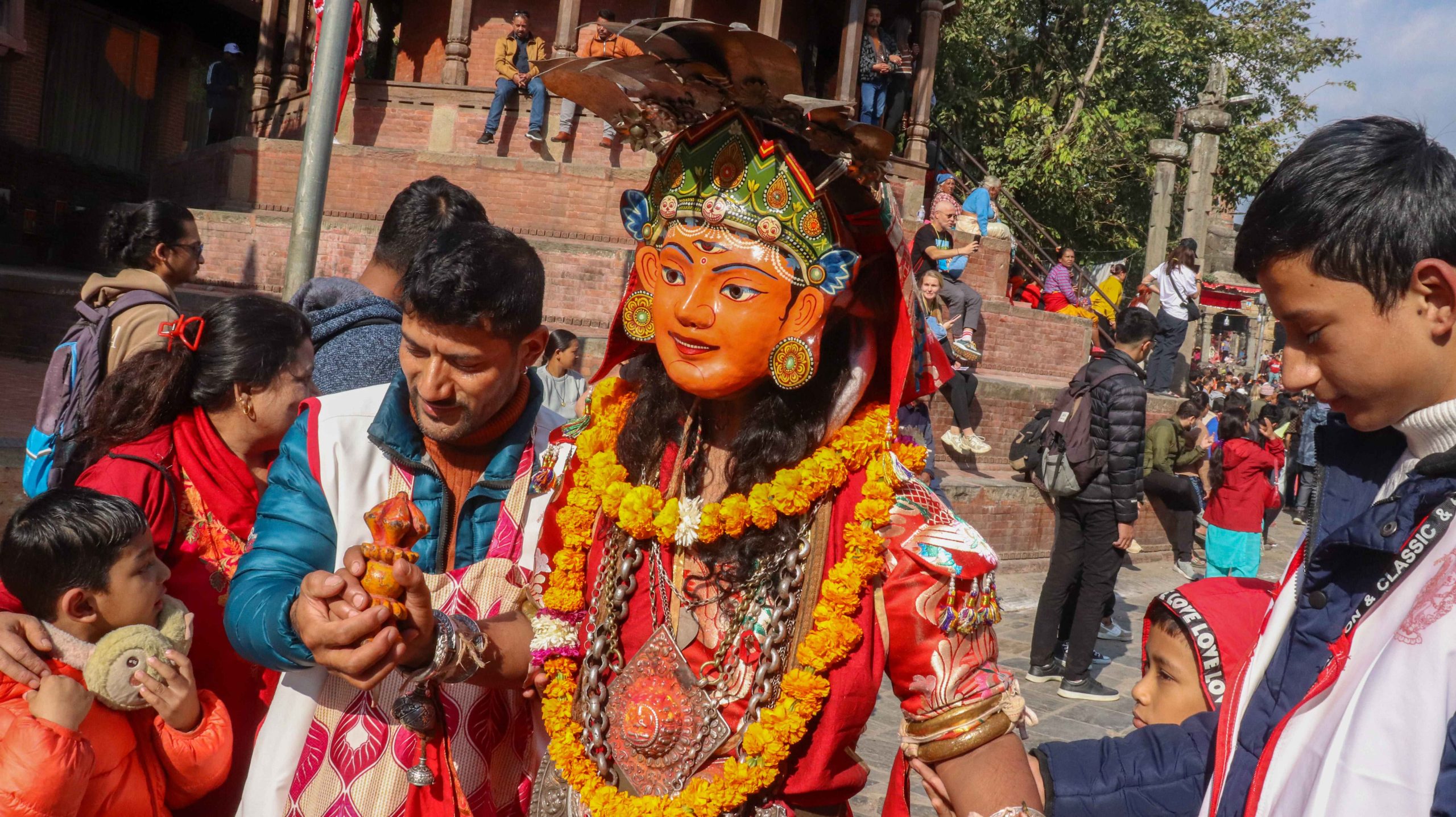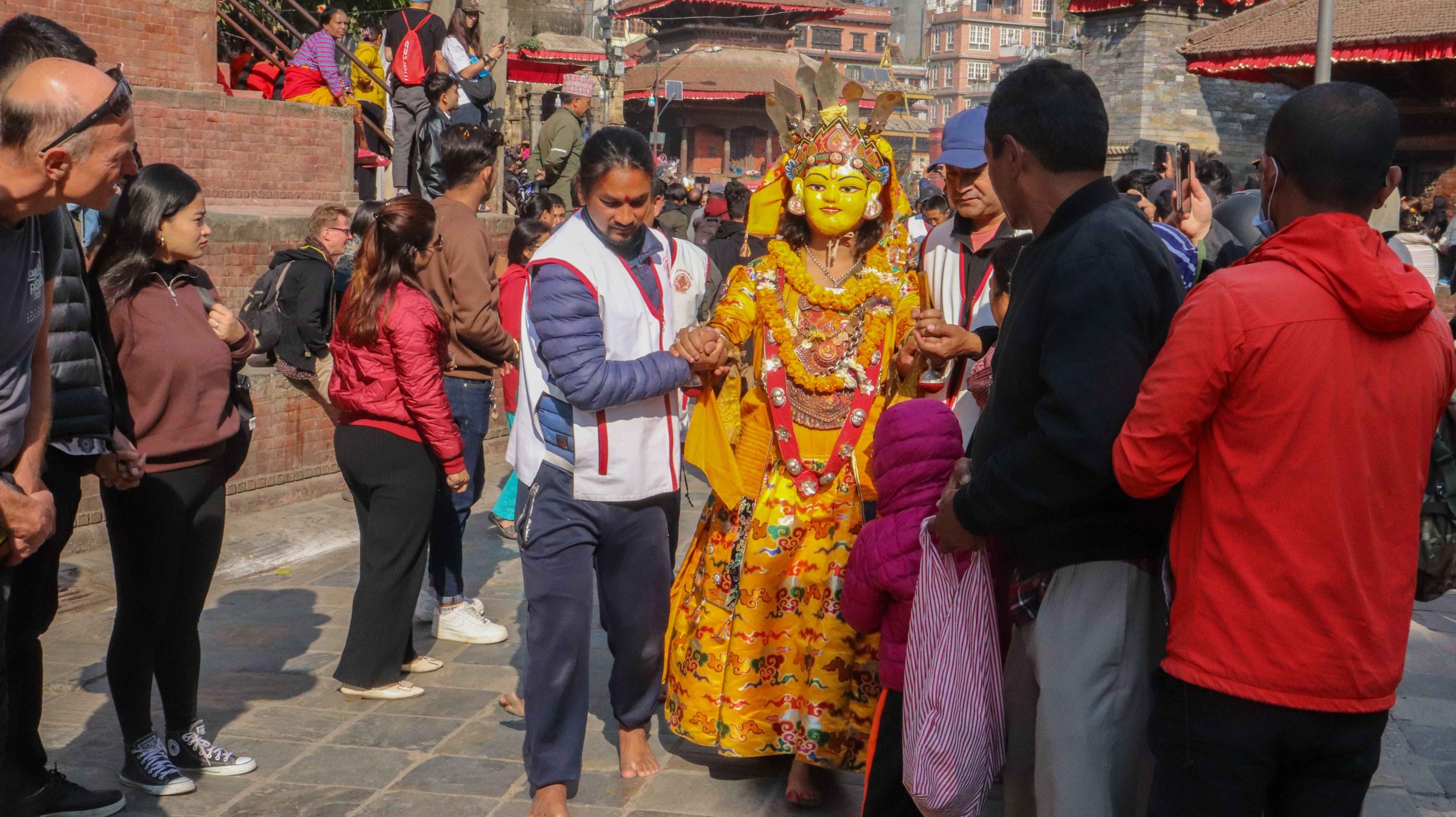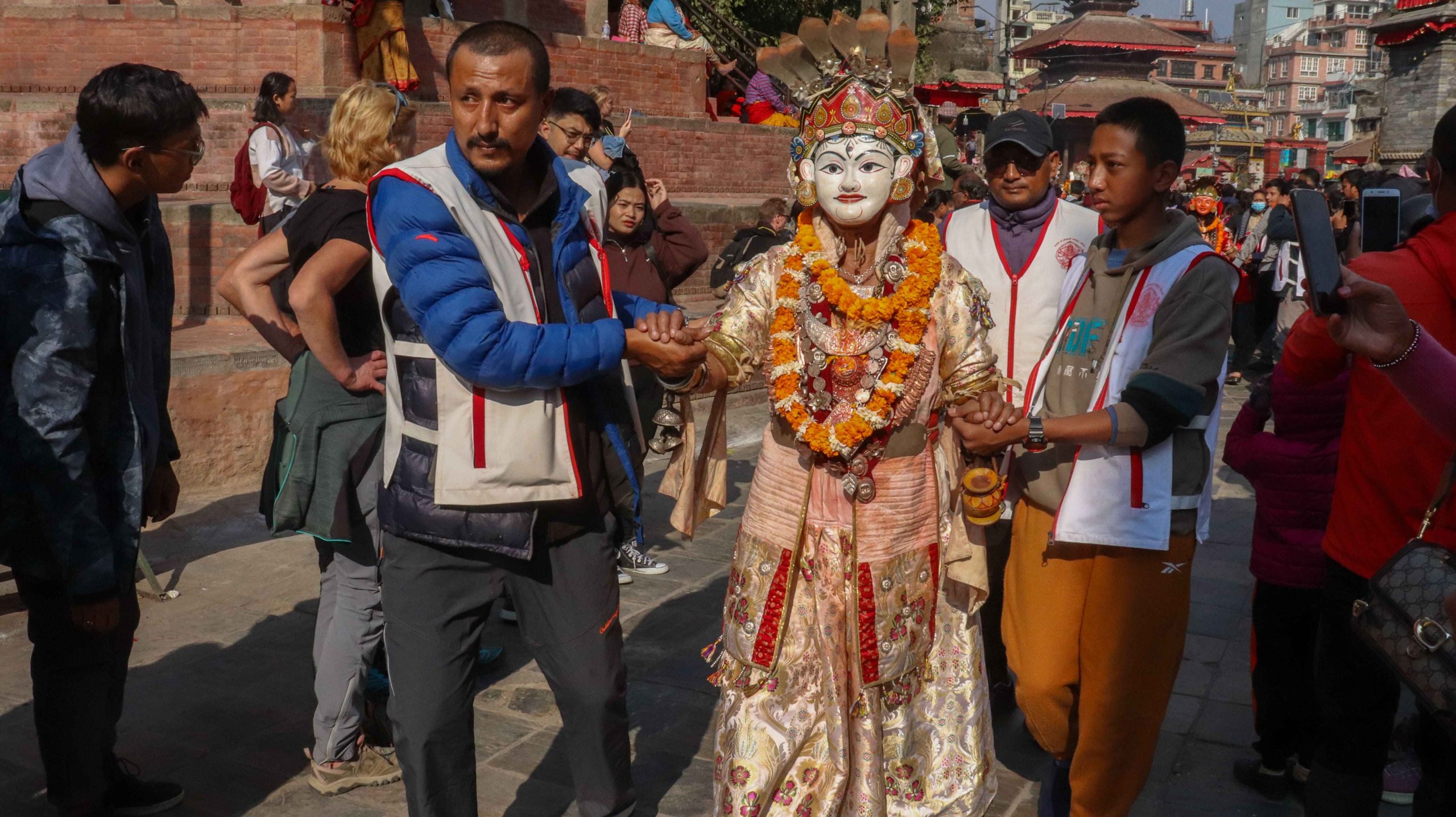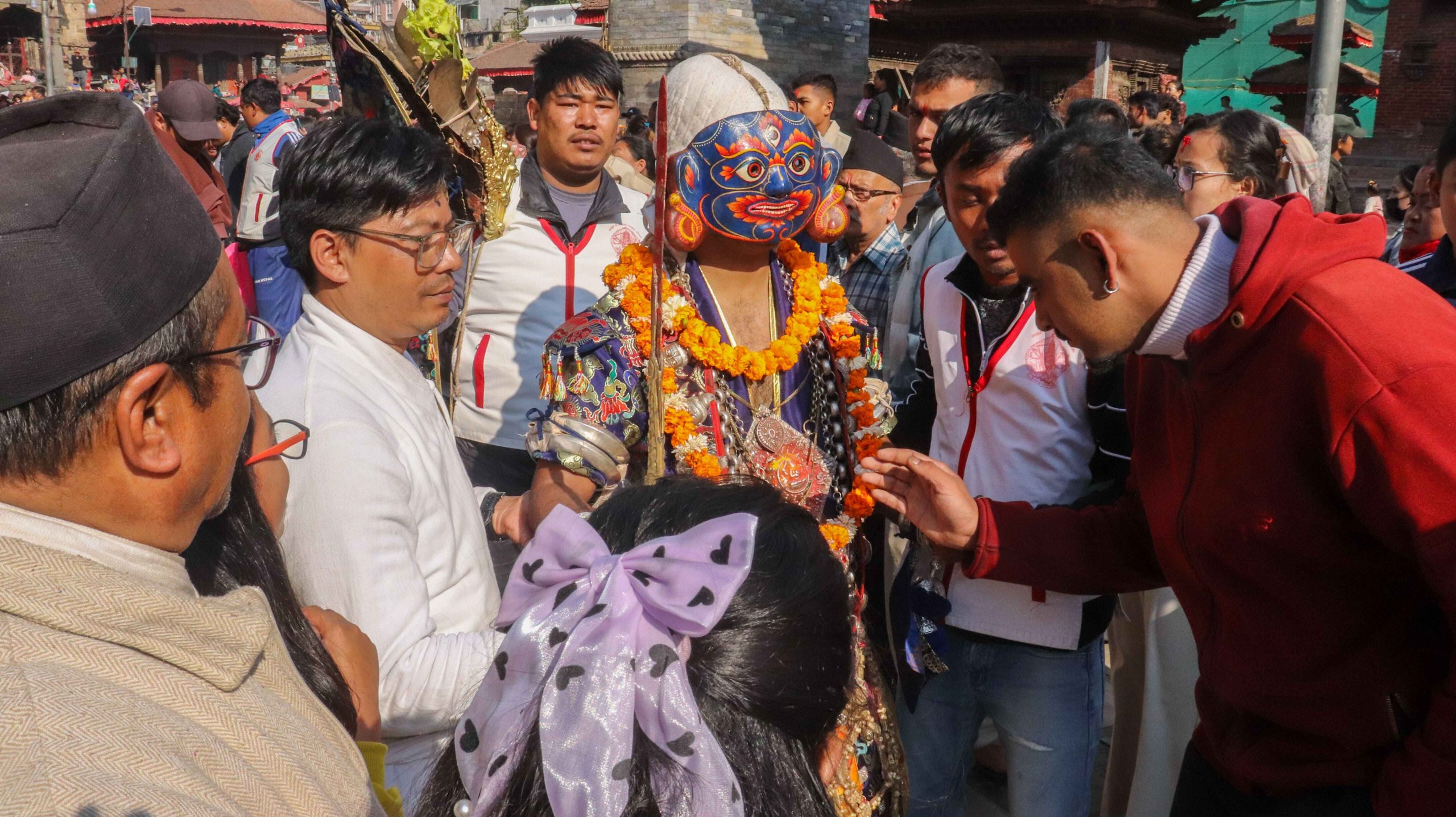 काठमाडौँ नरदेवीस्थित ङत भुलु’ अर्थात् श्वेतकाली अजिमा बाह्रवर्षे जात्राको क्रममा शनिबार हुनुमानढोको कालभैरवअगाडि डबलीमा नाचको क्रममा श्रीगणेश ।